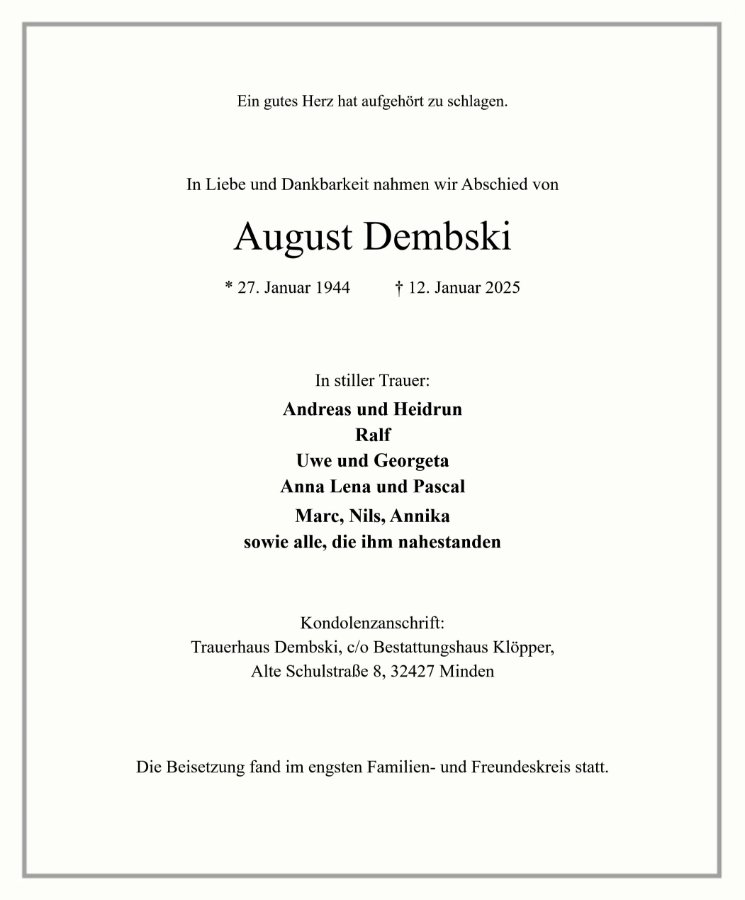 wir wünschen Ihnen von Herzen viel Kraft, dass Sie Menschen um sich haben, die Ihnen in dieser schweren Zeit beistehen und Halt geben. Zusätzlich können Sie auf dieser Gedenkseite Erinnerungen teilen und so das Andenken gemeinsam wachhalten.