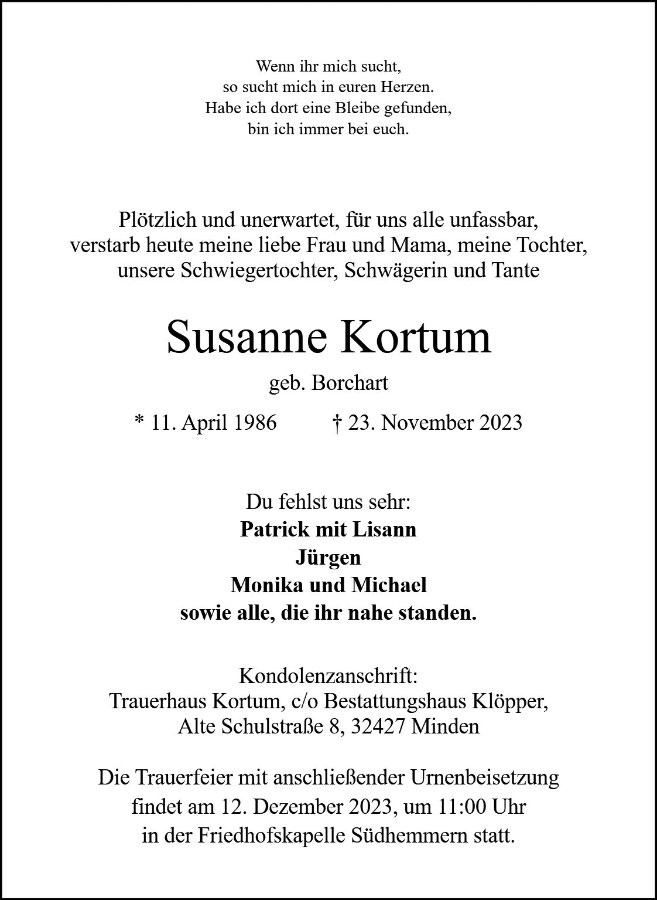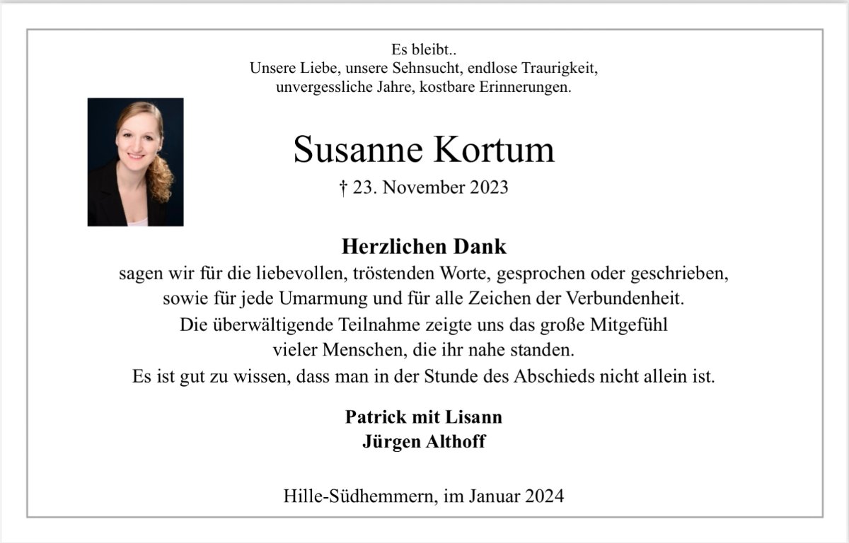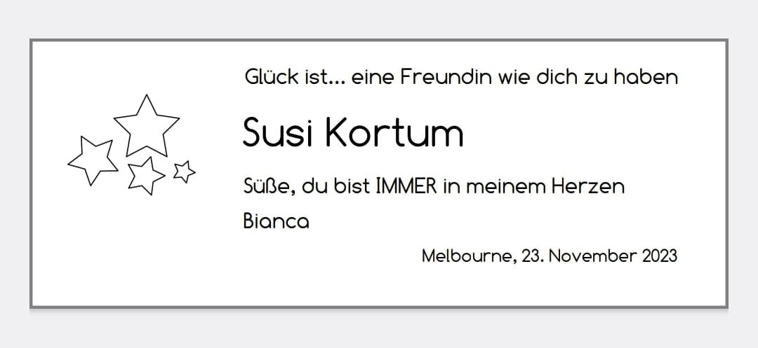 Ich denke an Euch und werde Susi in guter Erinnerung in meinem Herzen bewahren